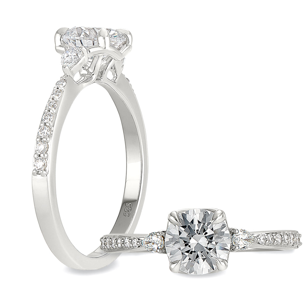 A hidden loop halo sits under the center stone, sitting above a single row of diamonds. Classic, yet modern.