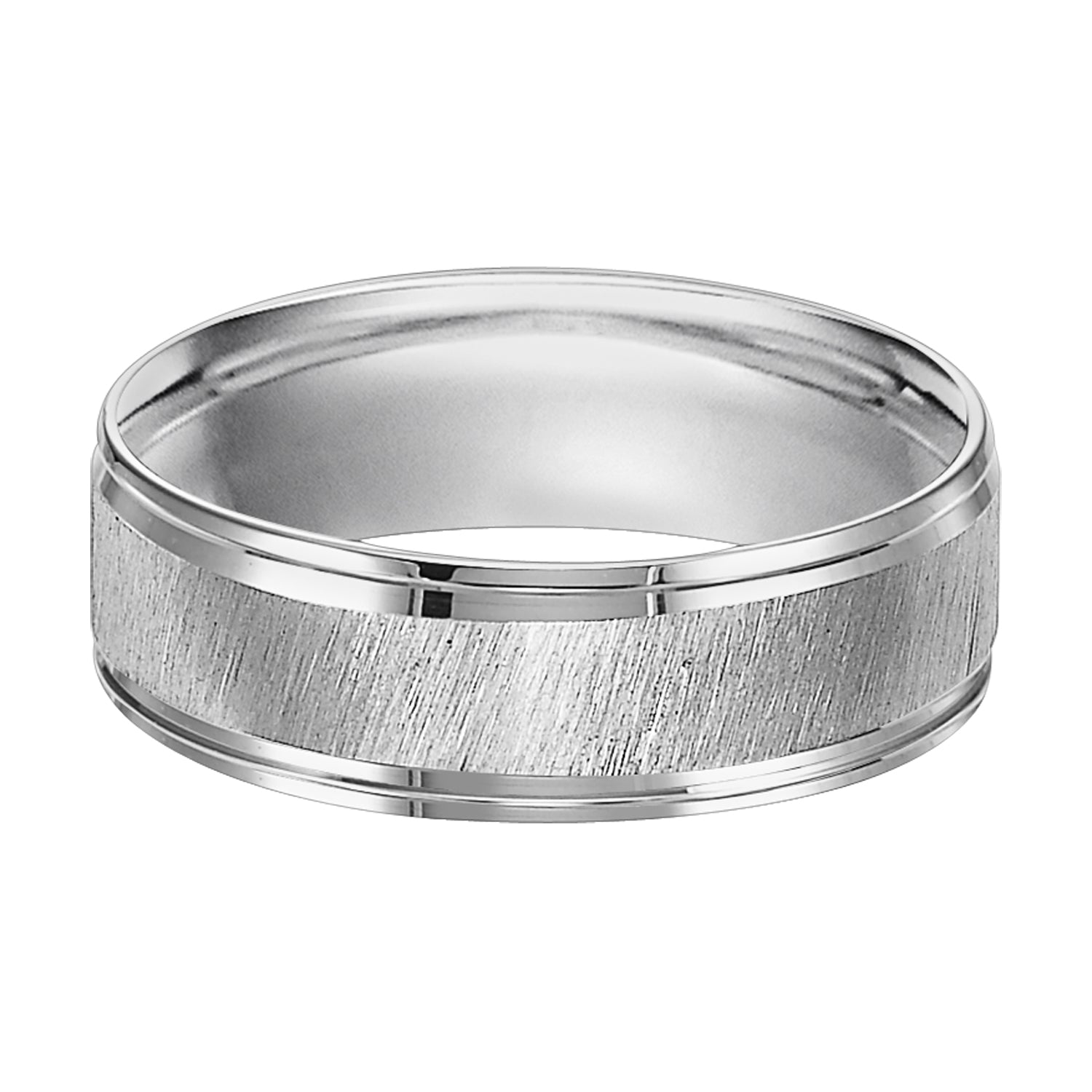 This Comfort Fit wedding band features a diagonal satin finish with stepped edge offering a refreshing look that will last a lifetime