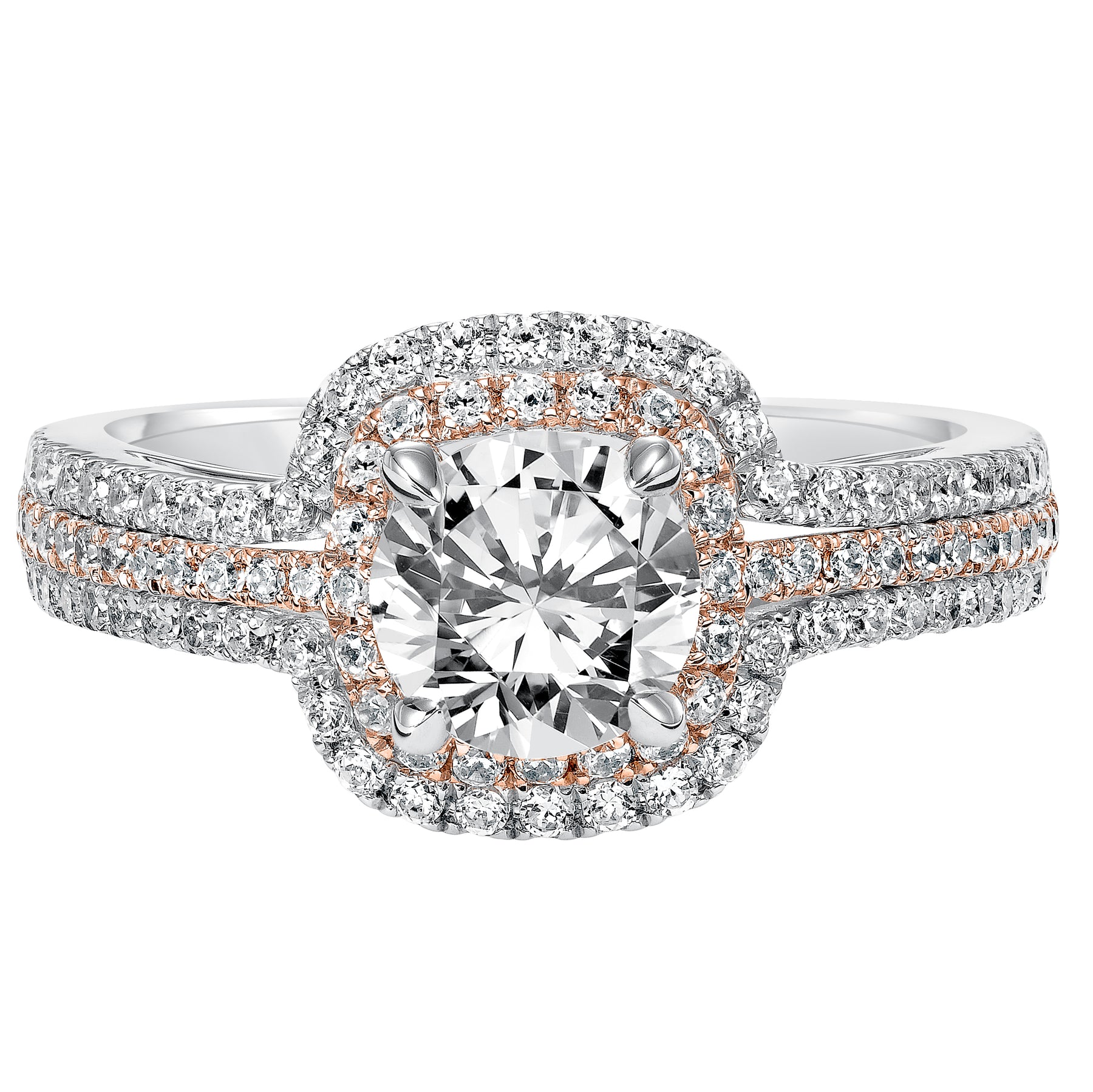 This engagement ring is truly breathtaking featuring both rose and white gold in its prong set diamond double halo and three row band design
