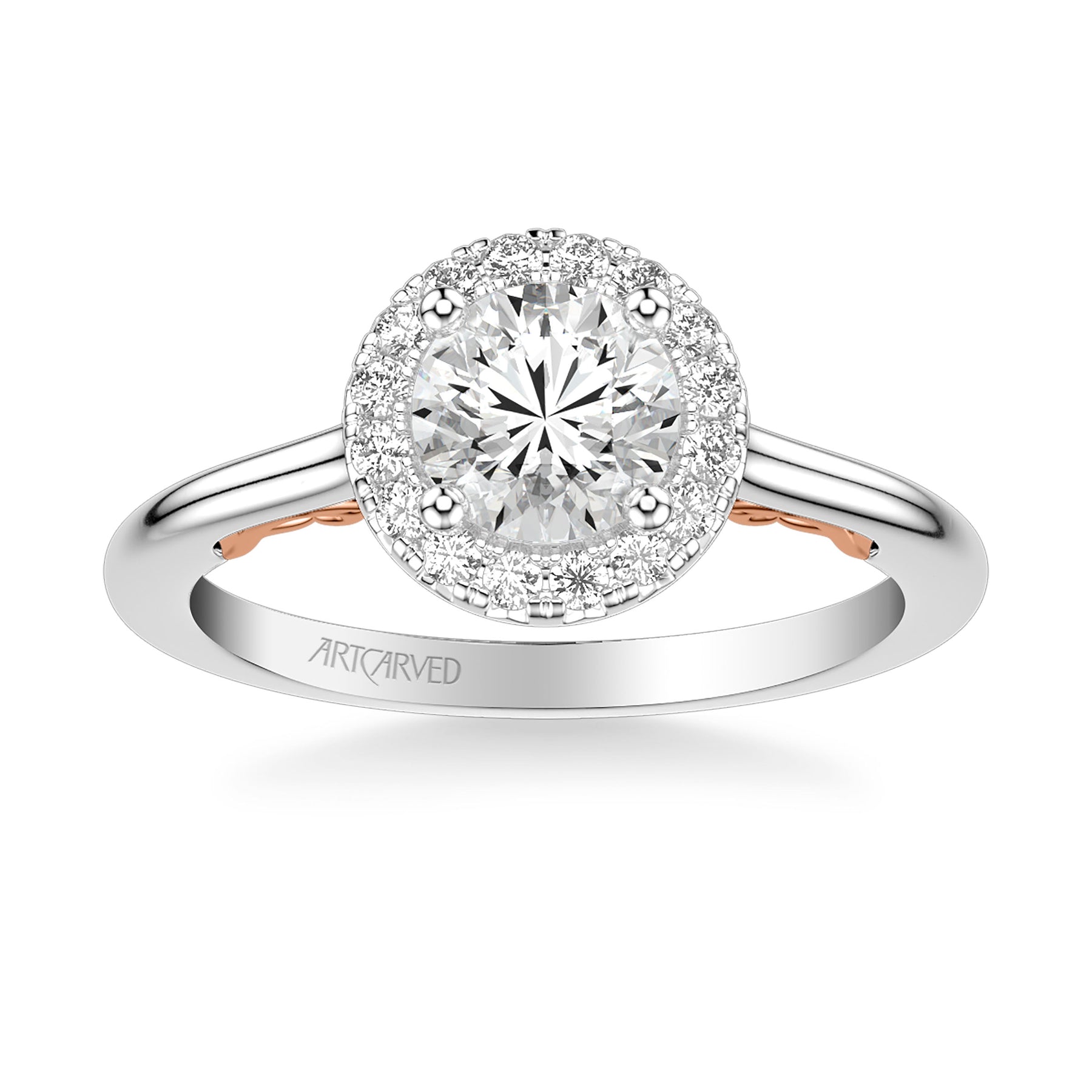 Lyric Engagement Ring with Round Diamond Halo and Carved Gallery details with Polished Shank