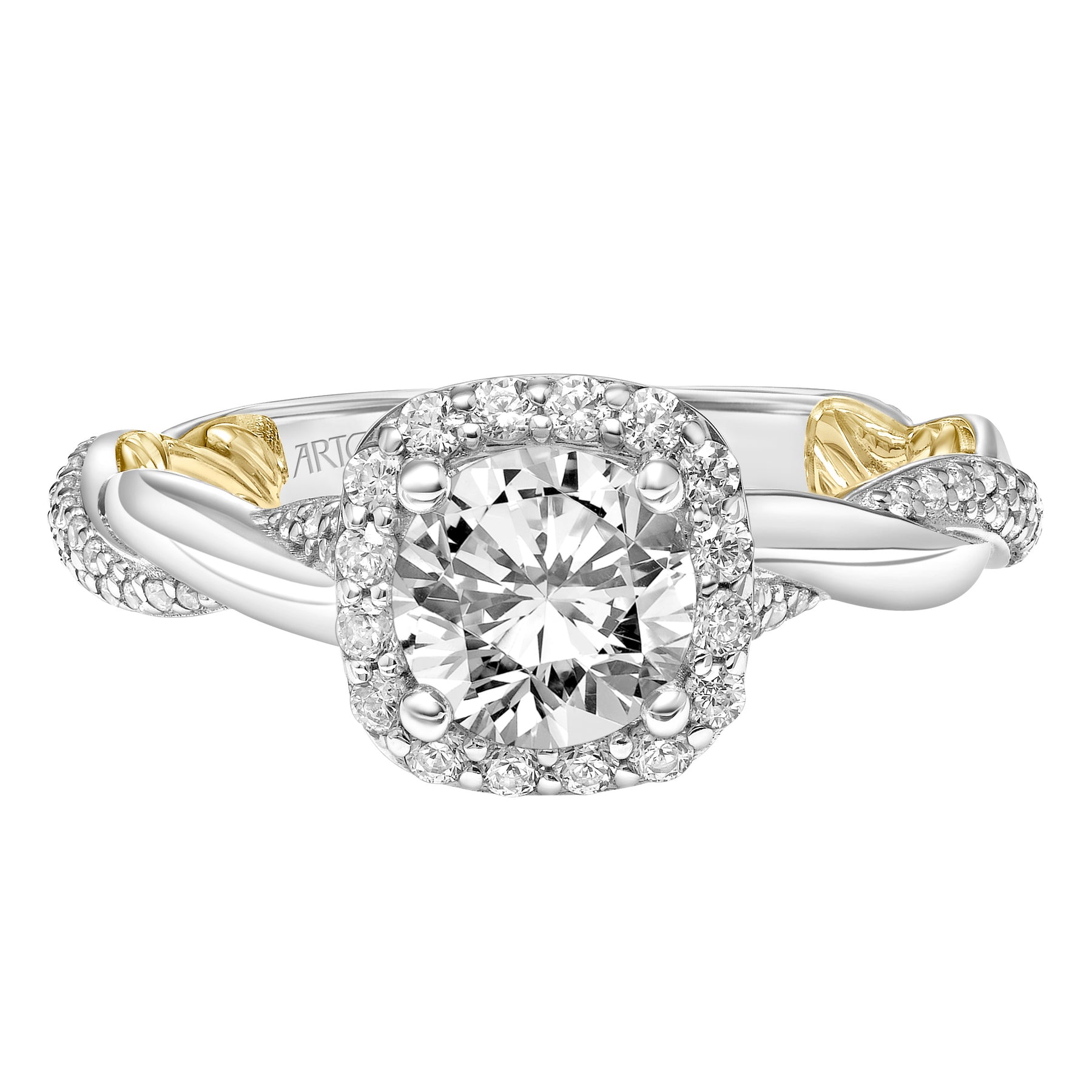 Lyric Engagement Ring with Cushion Diamond Halo and Accented Diamond Gallery with Twist Diamond and Polished Shank
