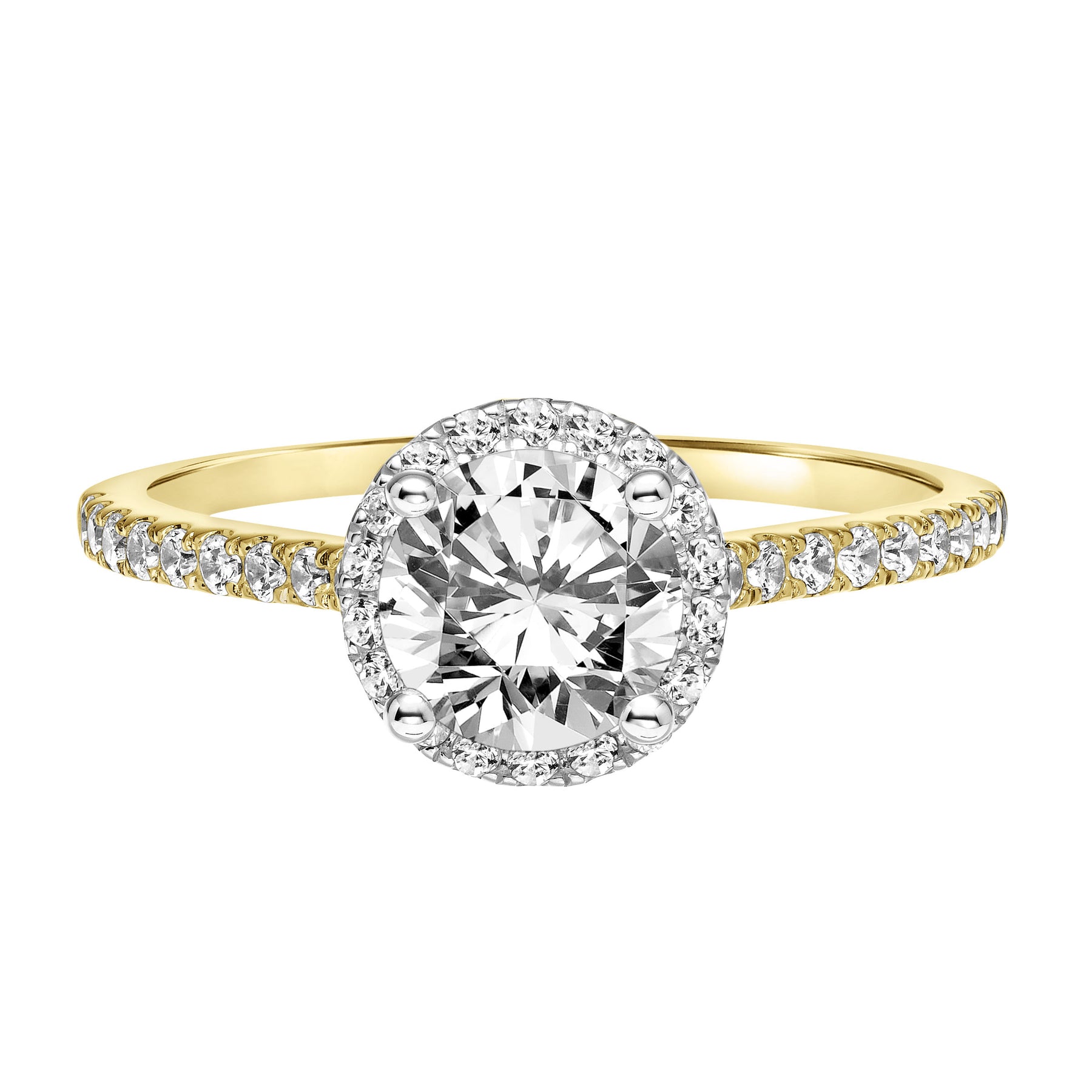 Classic Round Diamond Halo Engagement Ring with Two-Tone Prongs and Diamond Shoulders