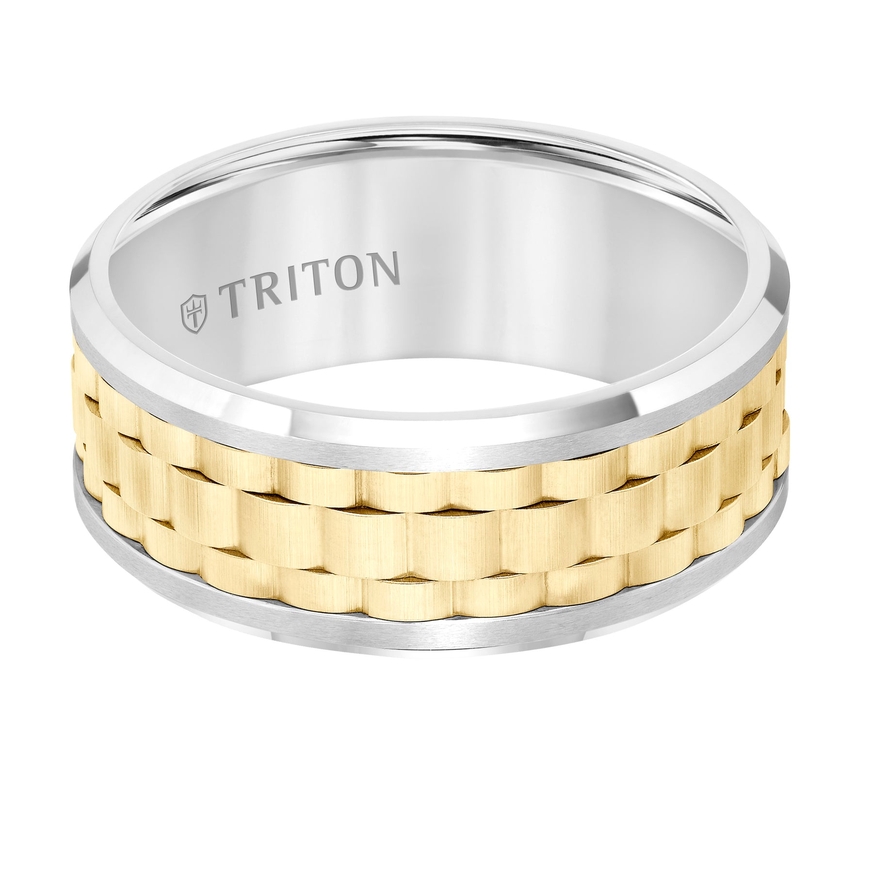 9MM White Tungsten Carbide Flat Comfort Fit Band with Yellow Basket Weave Center and Flat Rims