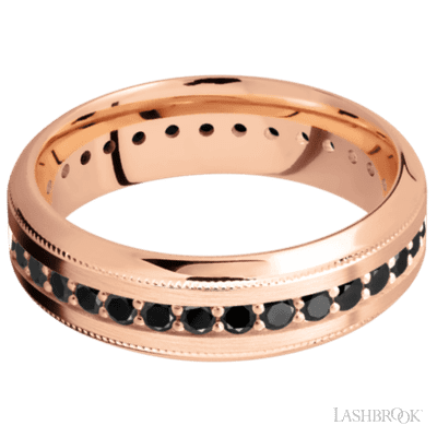 7 mm wide/High Bevel Milgrain/14K Rose Gold band with an Eternity arrangement of .03 carat Round Black Diamond stones in a Bead Channel setting.