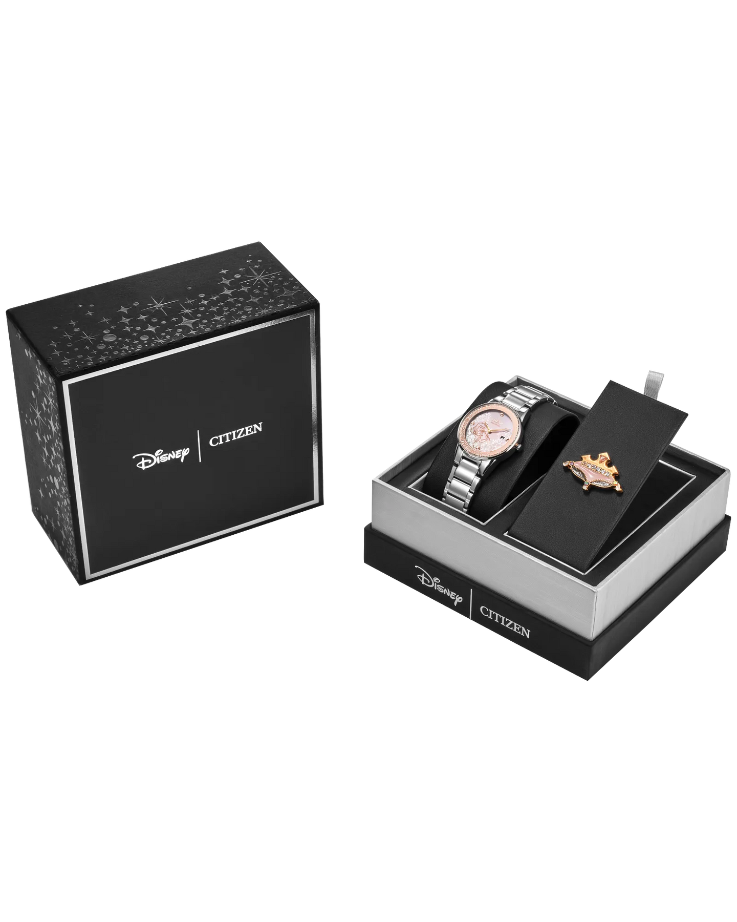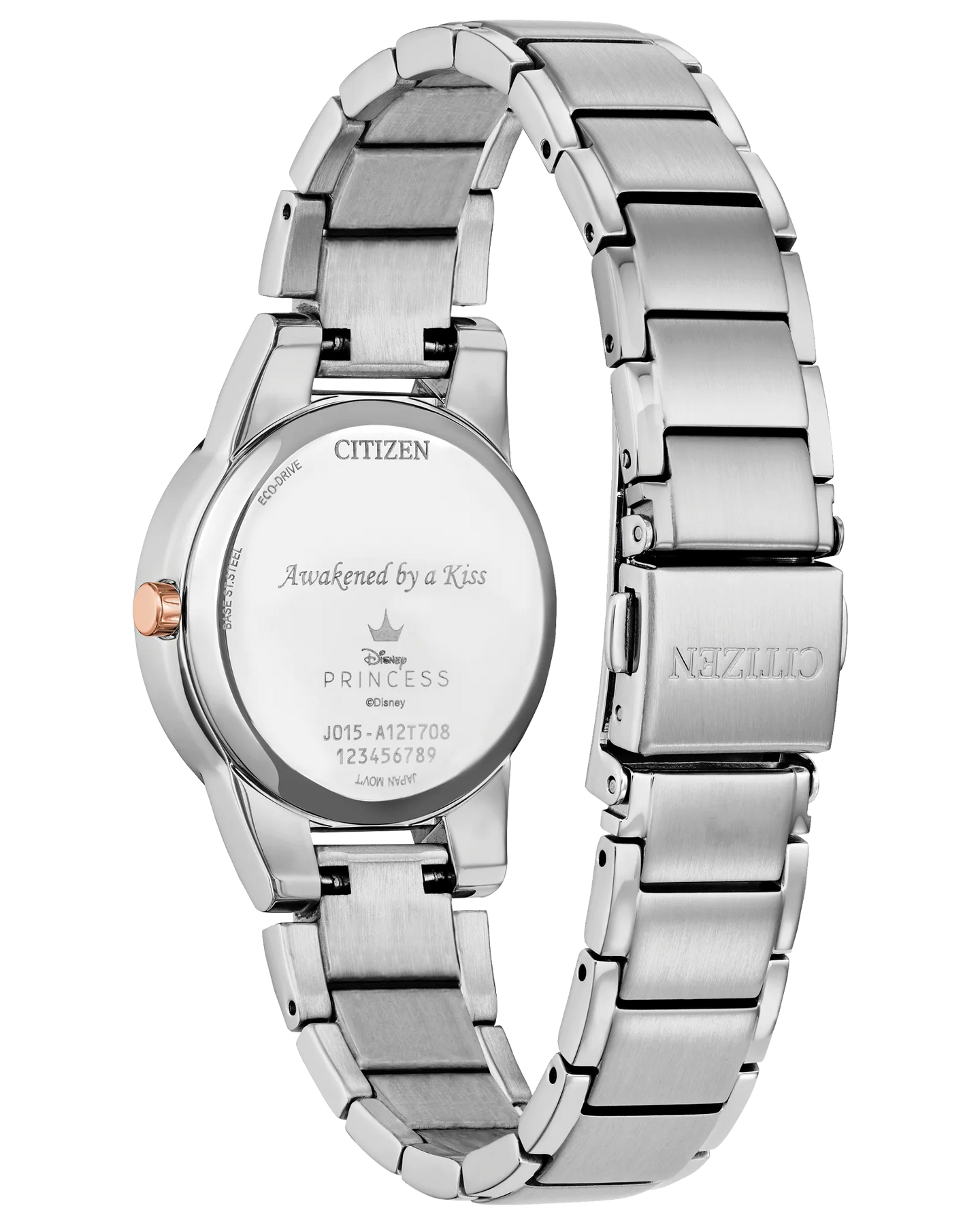 Embody the timeless allure of Disney’s Princess Aurora, aka Sleeping Beauty, with this sumptuous new boxed set. The pink mother-of-pearl dial is a work of art, featuring a rose-gold hued floral border with a crown at the top, four crystal markers, and gold-tone decorative hands. The focal point is a lovely portrait of the Disney princess holding a rose after being awakened by a kiss from Prince Philip. The 30mm brushed silver-tone stainless steel case and bracelet add contrast, and the specially packaged set is completed with a stunning collectible crown pin. As befits the nature-loving Aurora, the watch is sustainably powered by any light with Eco-Drive technology and never needs a battery. © 2024 DISNEY