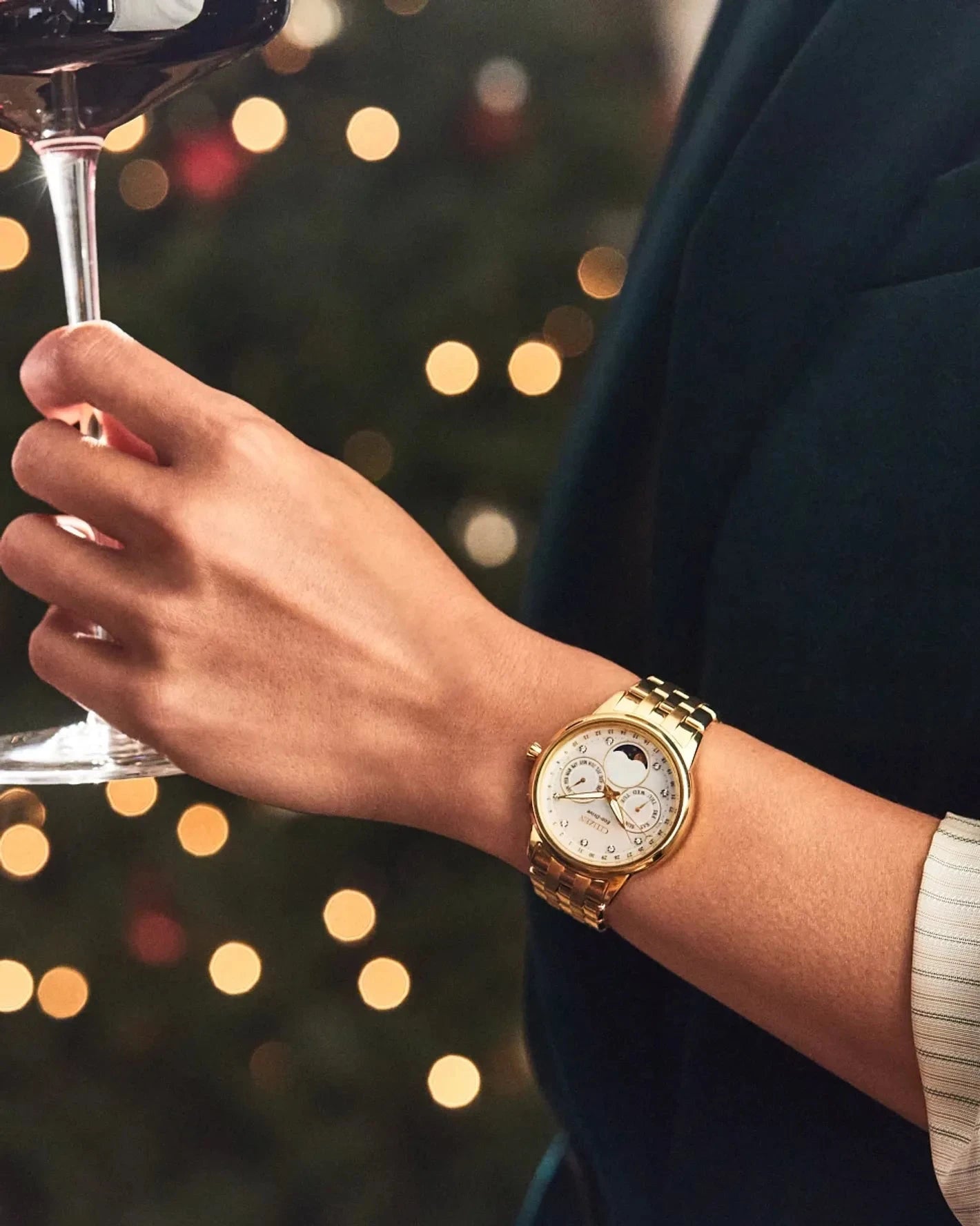 The latest women’s Calendrier timepiece from Citizen arrives with classic charm paired with advanced technology. The gold-tone stainless steel 37mm case features a white mother-of pearl dial inset with nine sparkling diamonds to complete the look of refinement. In addition to the time, this must-have watch also highlights the month, day and date and keeps track of the phases of the moon. The gold-tone stainless steel bracelet has a deployment clasp for easy access. Also featuring Eco-Drive technology that’s sustainably powered by any light and never needs a battery, it’s the perfect blend of style and function and will add a modern elegance to your wardrobe.