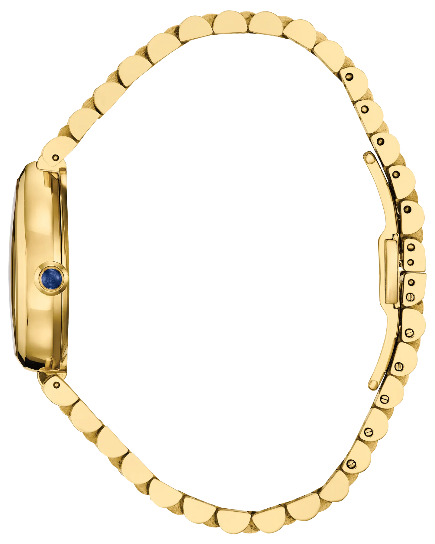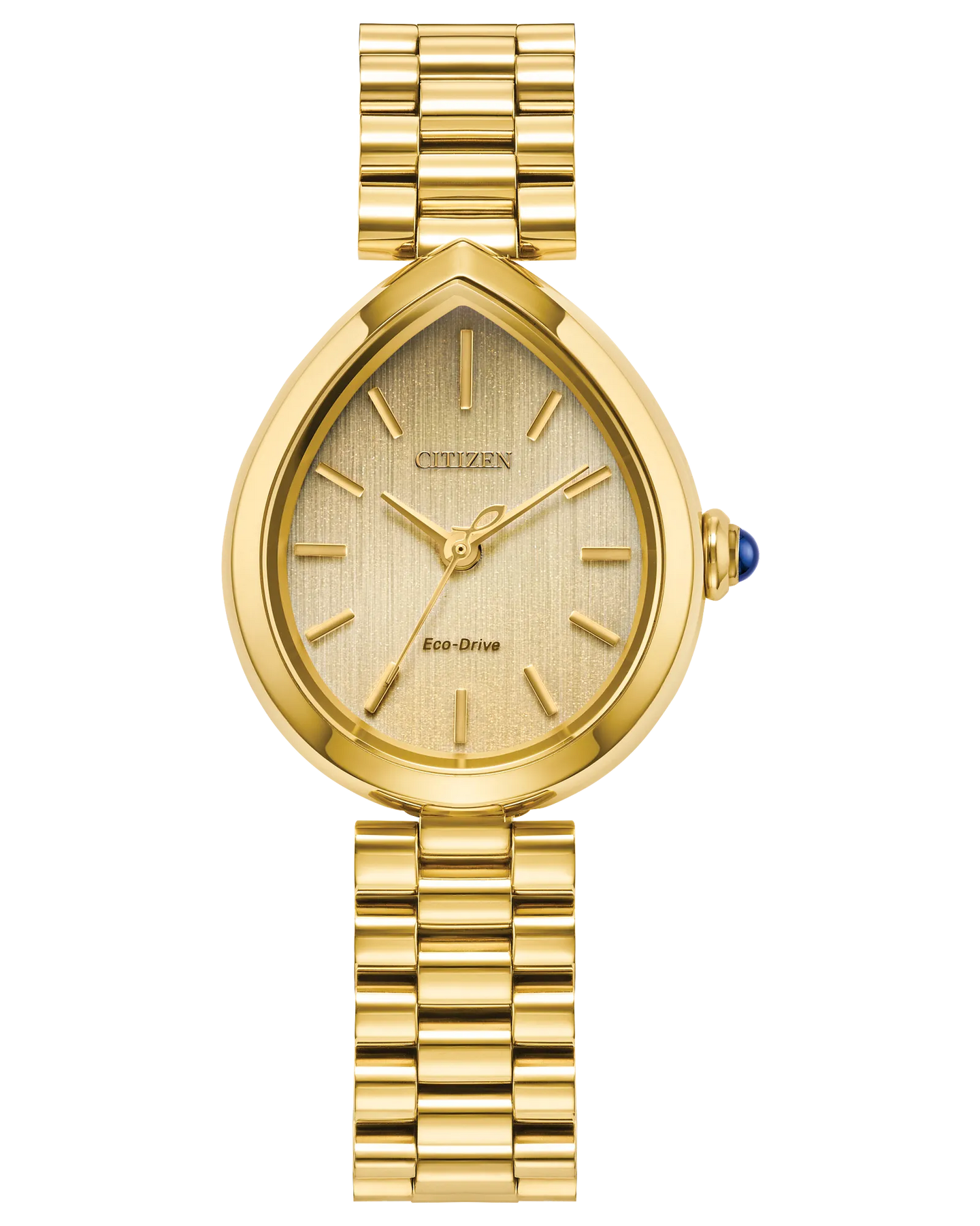 Flirty and feminine, the new Citizen L Rainell is a watch as creative and elegant as those who wear it. With subtle dimensions of 26mm by 31mm, the signature shape of the timepiece speaks for itself in an elevated gold-tone stainless steel. An integrated bracelet and synthetic sapphire-set crown punctuate the look. A lovely gold-tone dial follows the shape of the case, with a brushed background playing host to refined details in applied indices and matching hands. Sustainably powered by any light with our proprietary Eco-Drive technology that never needs a battery. Water resistant up to 50 meters. Caliber E031.