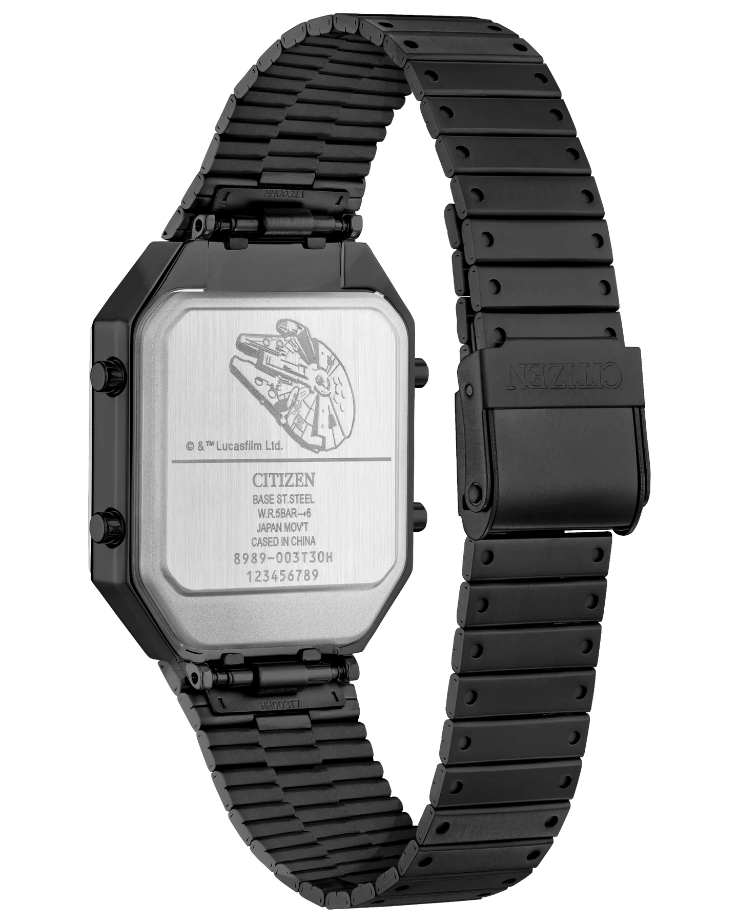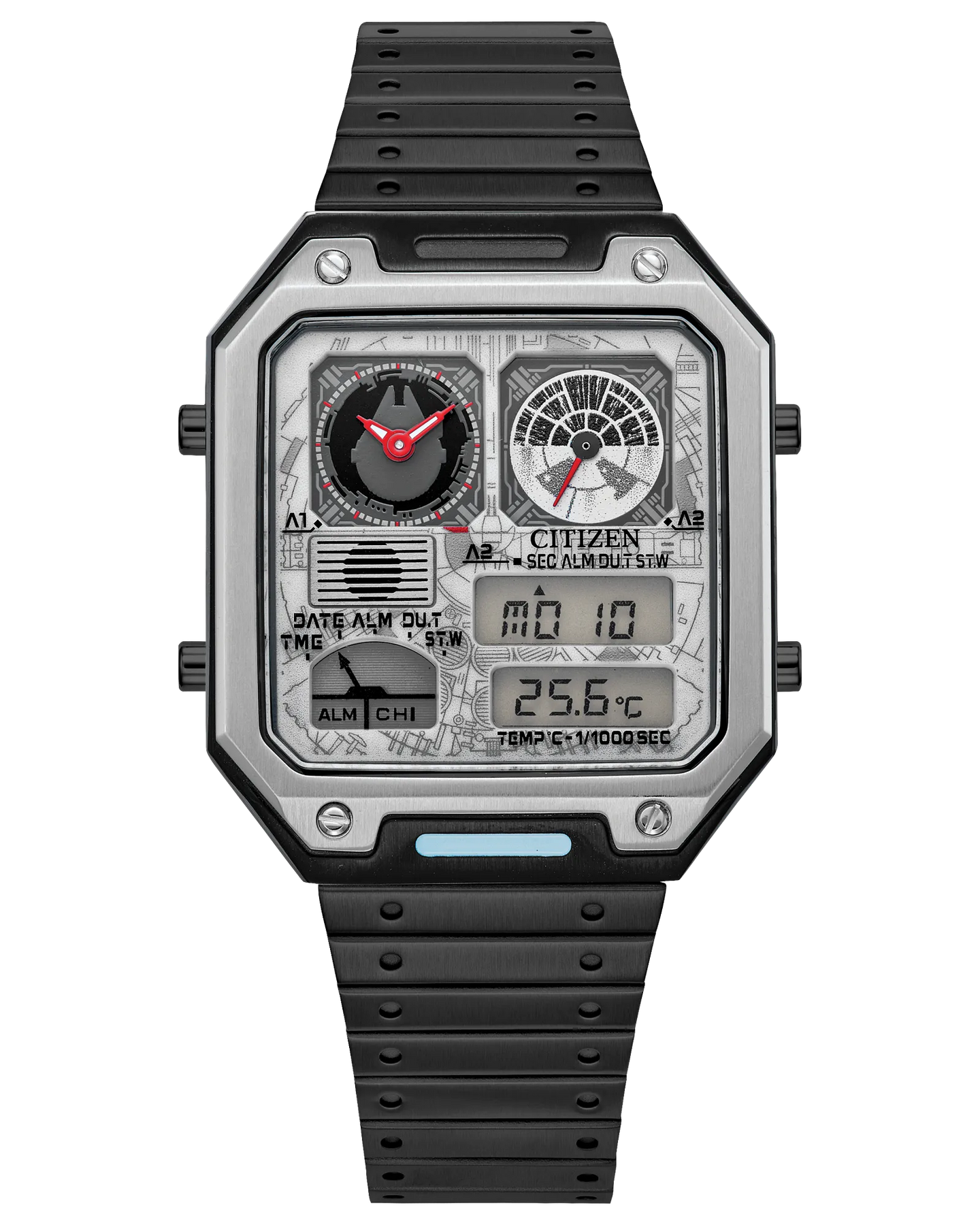 Not everyone belongs to the dark side of the Force, and sometimes a battle has no winners. Representing one of the most epic lightsaber duels in the Star Wars™ galaxy, the struggle between Luke Skywalker™ and Darth Vader™ on Cloud City was pivotal to their family struggle. This Citizen and Star Wars original timepiece features a silver-tone stainless steel case and bracelet on a black outlined dial with green pops of color and blue and red markers. The highlight is the dial’s bold graphic center recreating the famous duel with neon-colored hands symbolizing the lightsabers. The case back is etched with Vader’s striking line from Star Wars: The Empire Strikes Back™, “I find your lack of faith disturbing.” For Star Wars and Citizen fans alike, this collector’s timepiece is powered with our proprietary Eco-Drive technology that converts energy from any light and never needs a battery. Water resistance to 200 meters. Caliber J810.