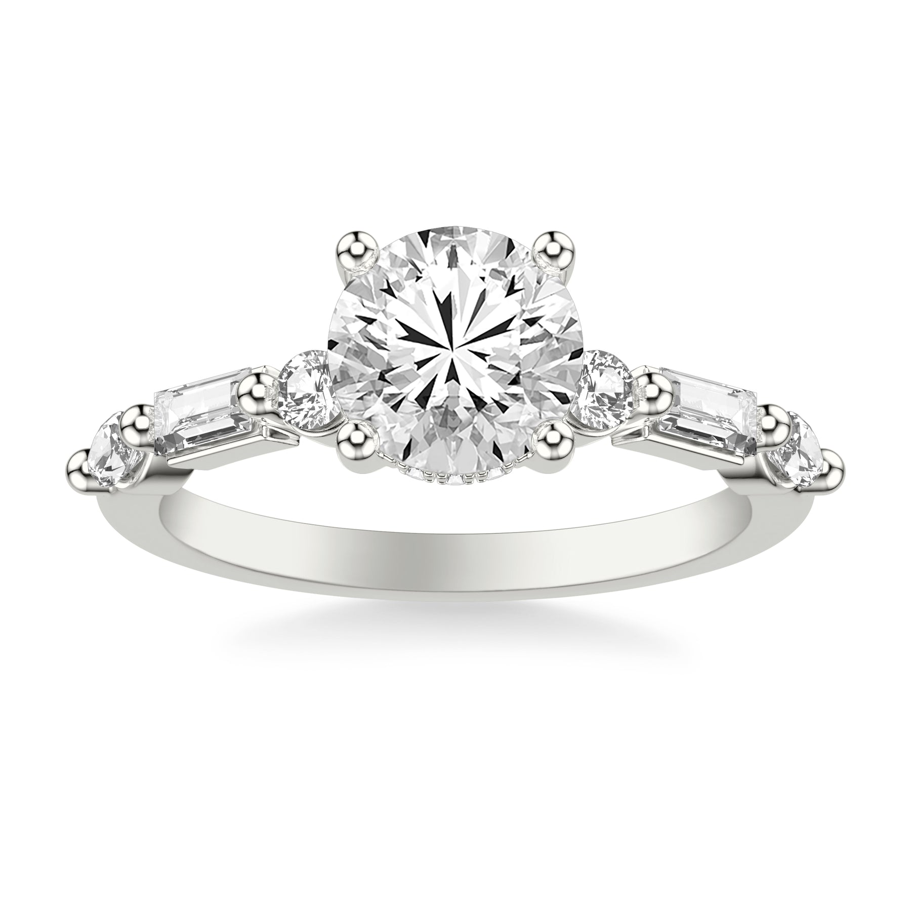 Contemporary Engagement Ring with Hidden Diamond Halo and Mixed Fancy Round and Baguette and Marquise Diamond Shank