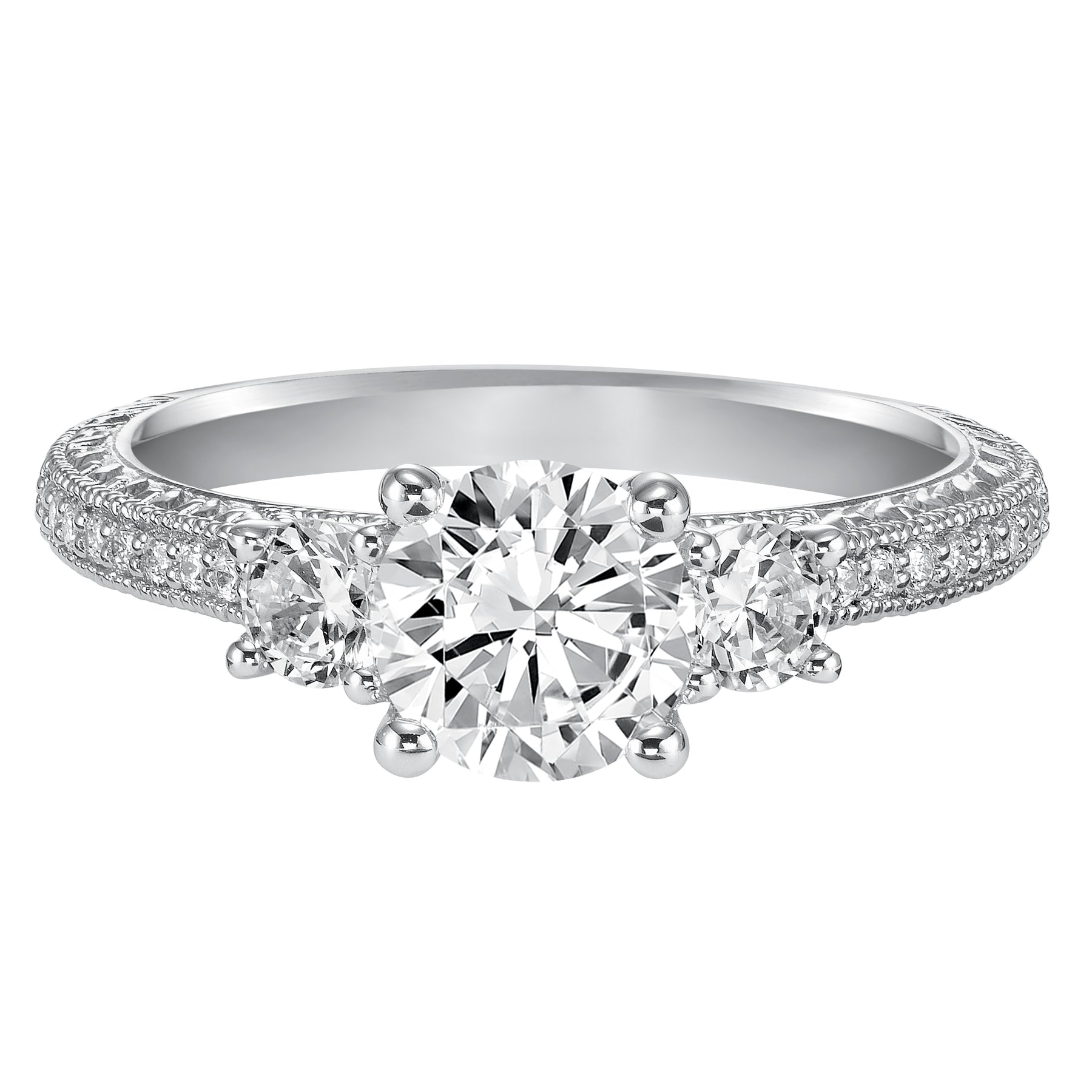 This eye-catching 3-stone engagement sparkles with its diamond prong set band with engraving and milgrain details