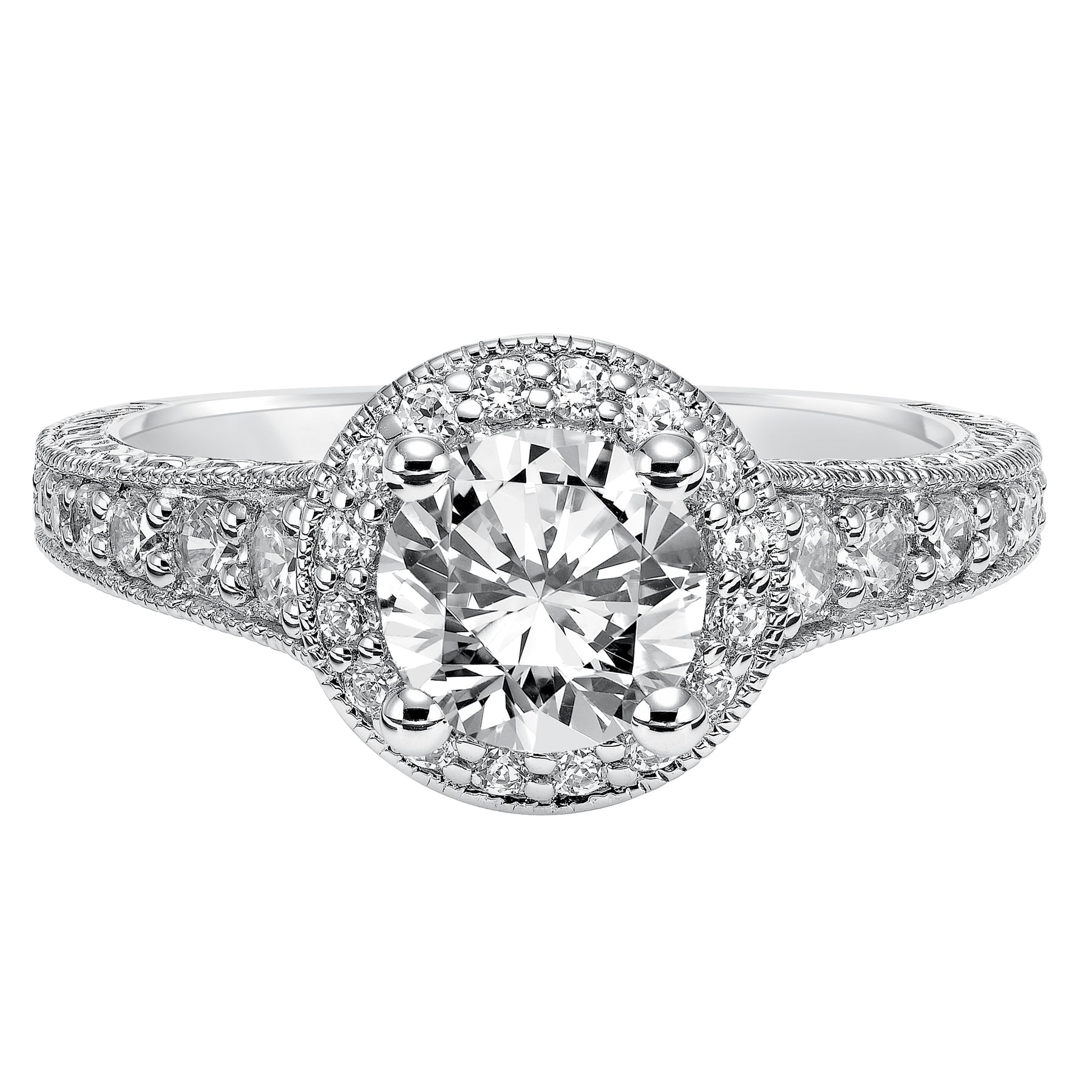 This show-stopping engagement ring is sure to impress with its diamond prong set halo and band with milgrain and engraving