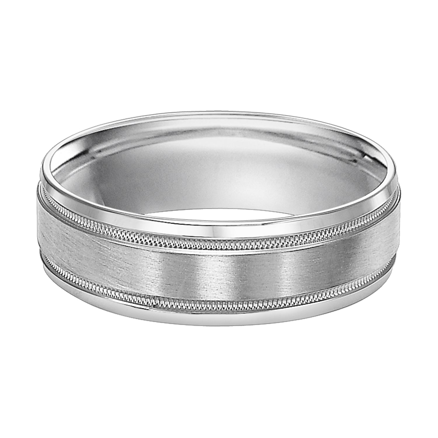 Men's wedding band with satin finish, milgrain accent and bevel edges with flat profile