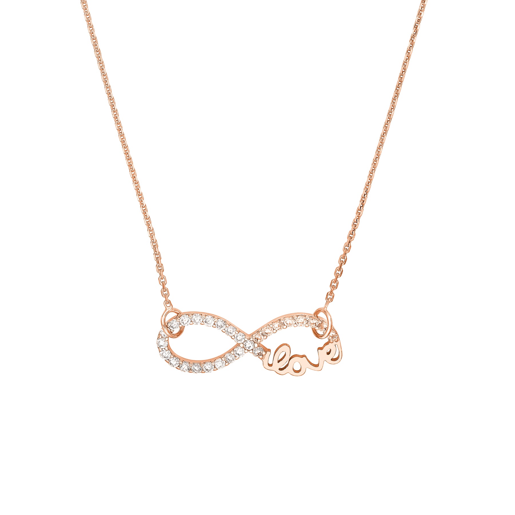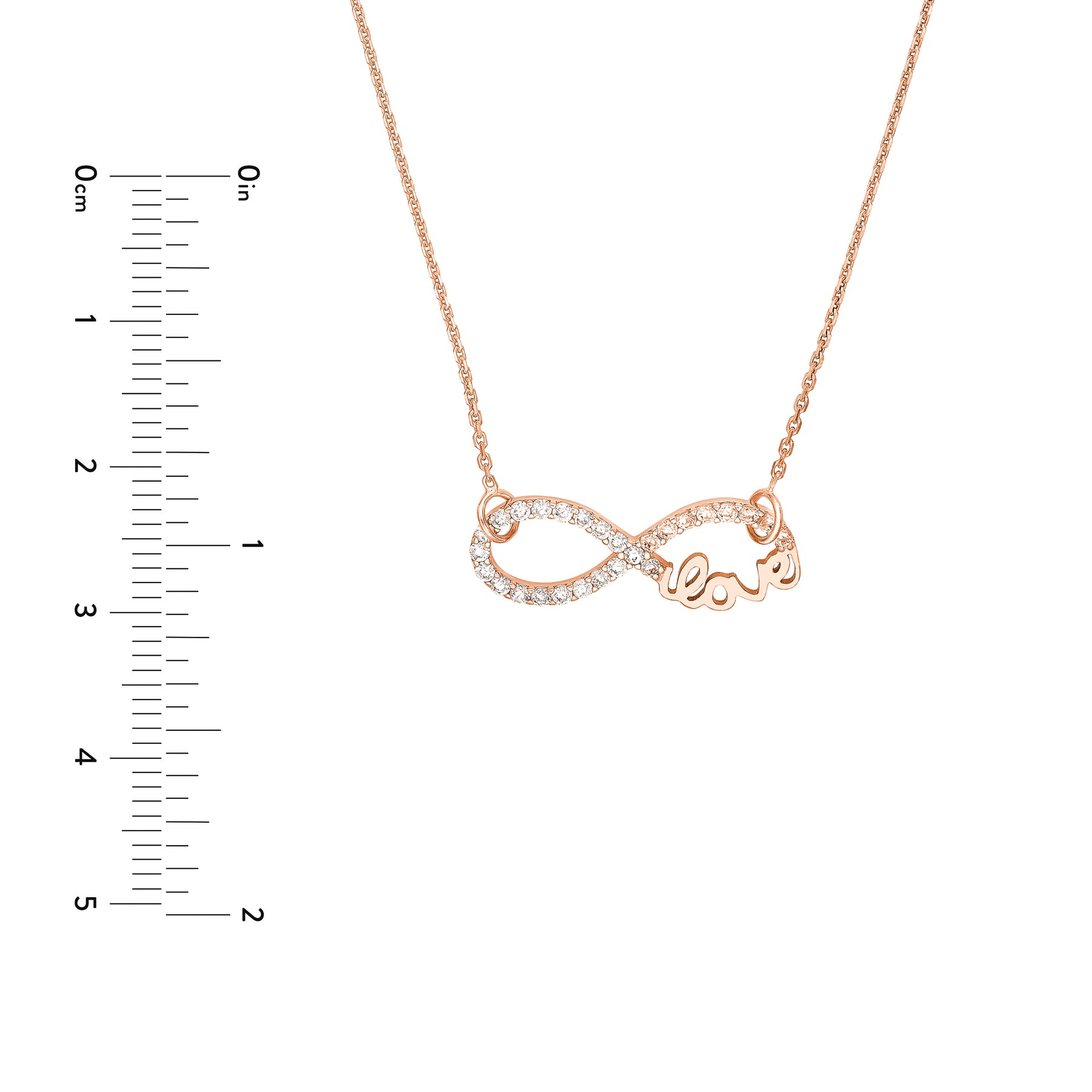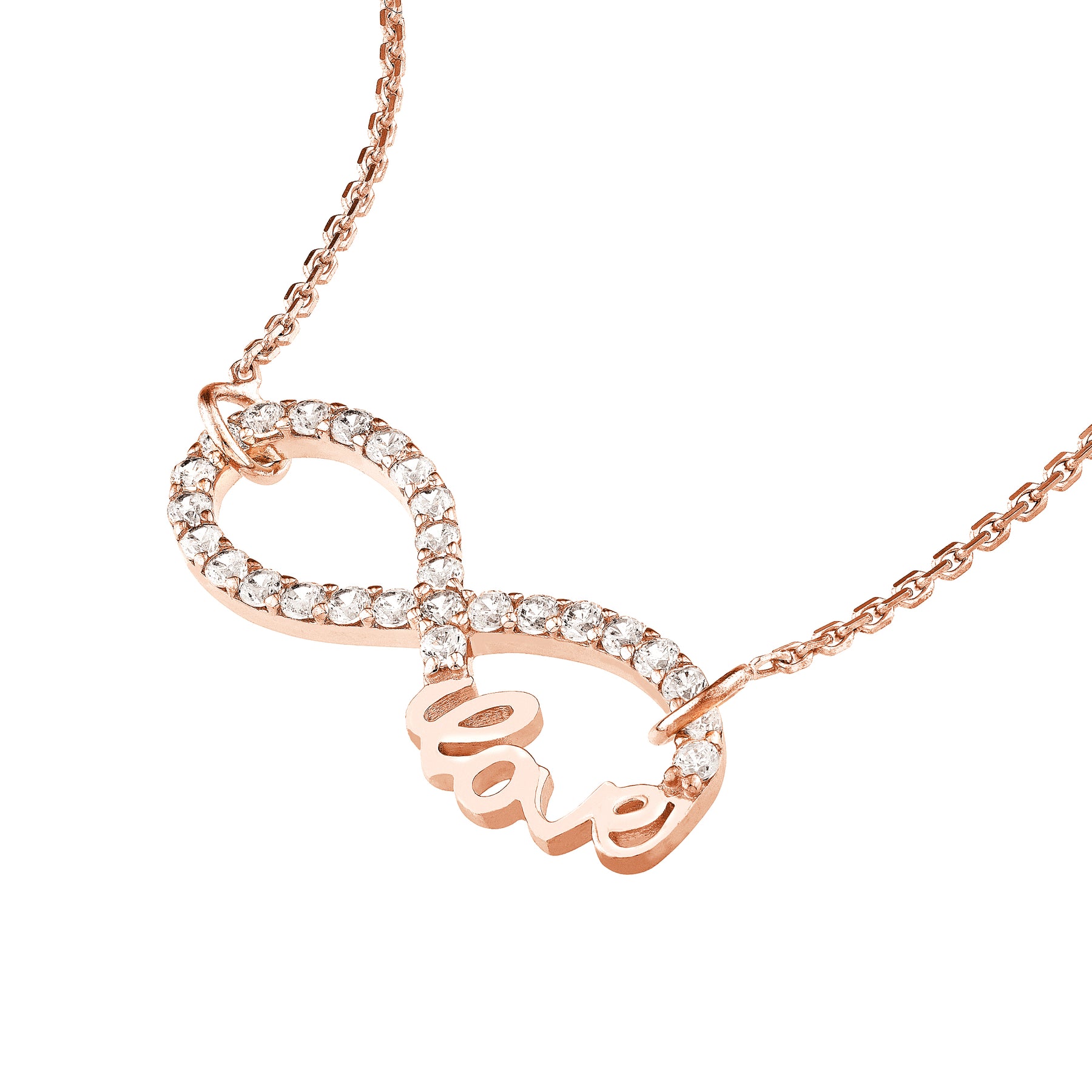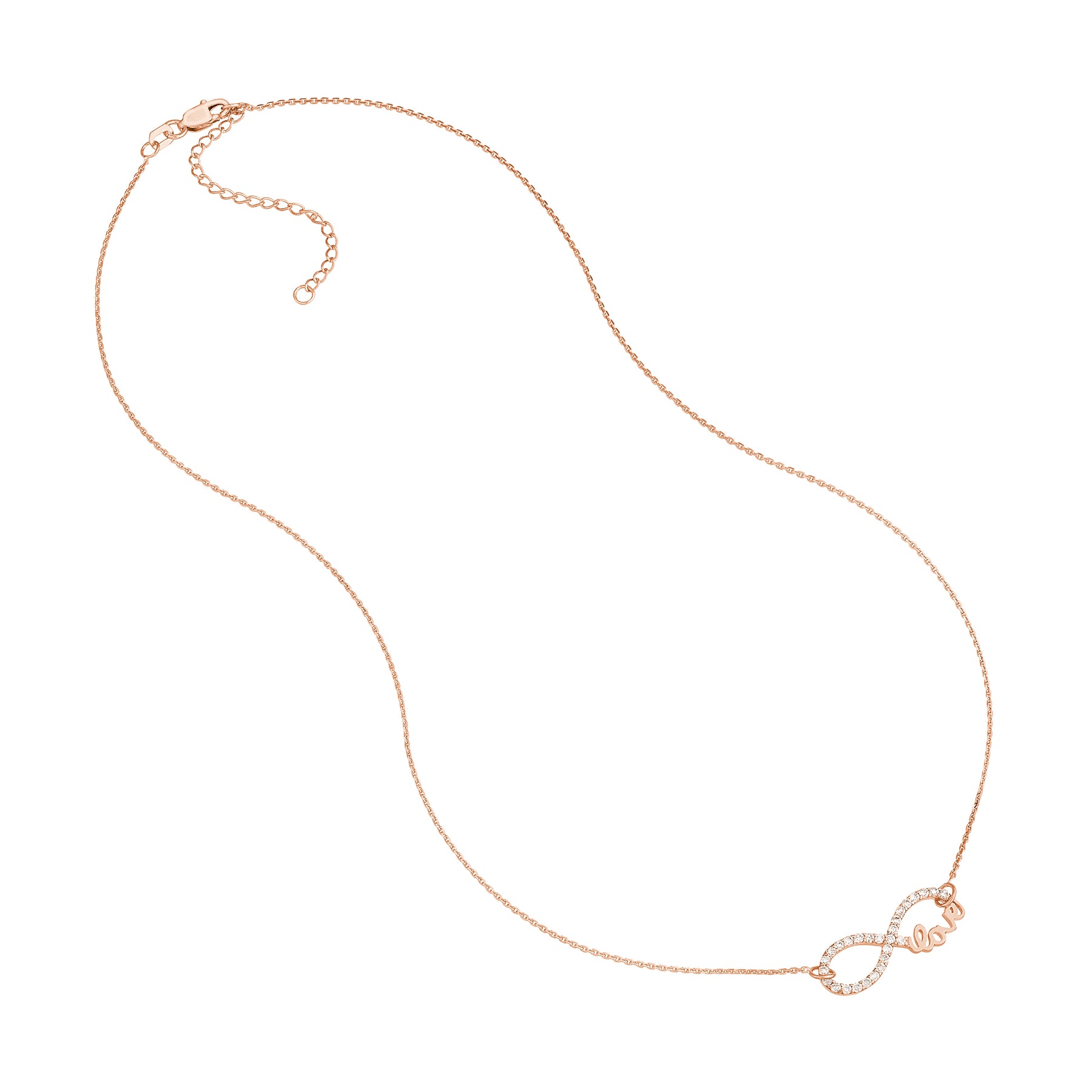Hold this timeless infinity symbol close to your heart. This CZ infinity symbol necklace with love in script hangs on an adjustable chain from 16 - 18 inches.