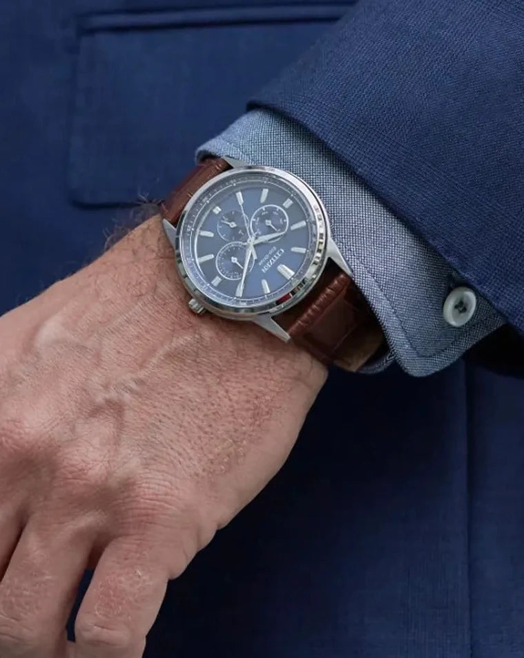 The CITIZEN Corso collection, a combination of functional simplicity with a touch of timeless elegance is not only a solar watch, but powered by any light with Eco-Drive technology. This model features a men's stainless steel case and chocolate brown leather strap with midnight blue dial, day/date display and 12/24-hour time. Caliber number 8729.