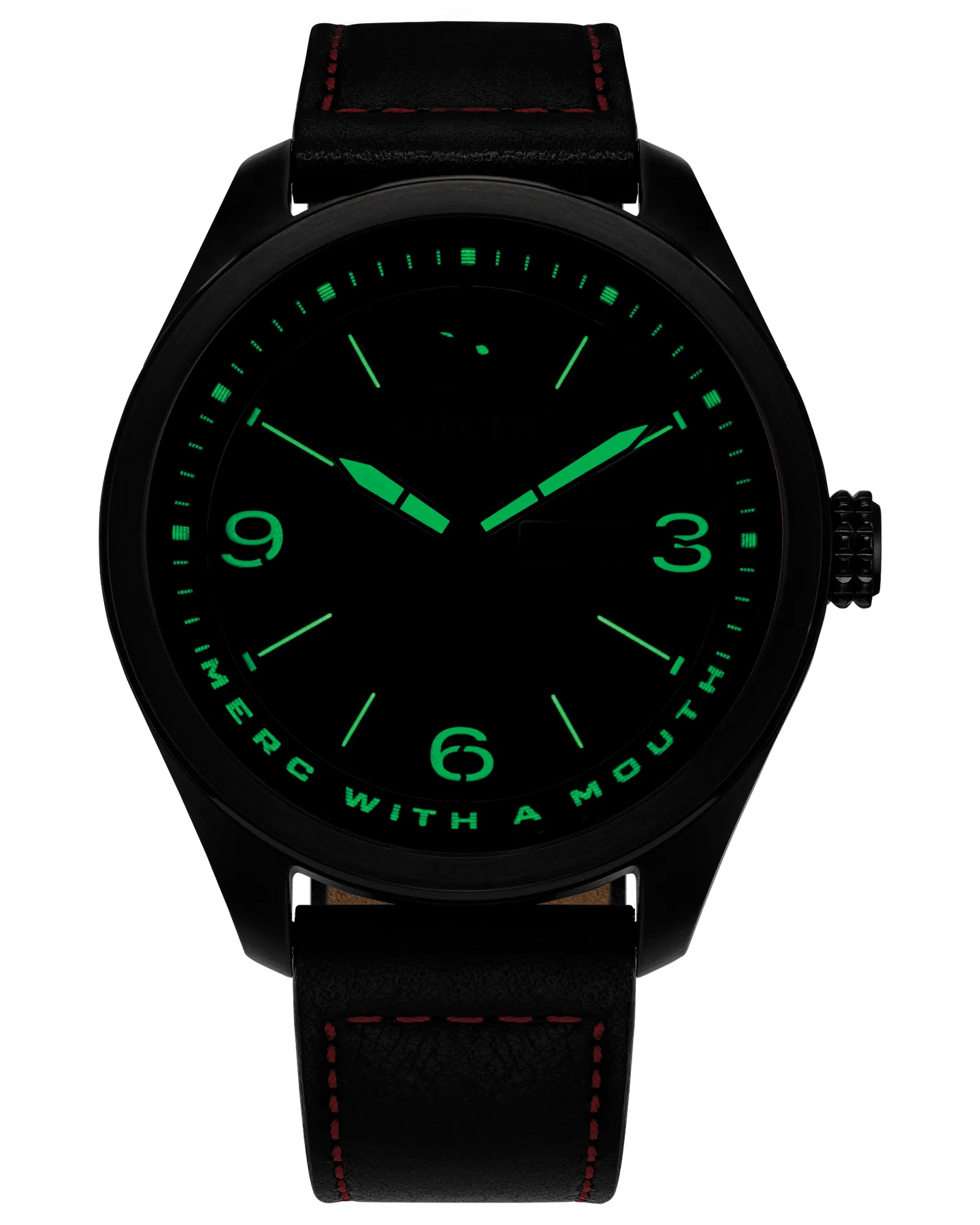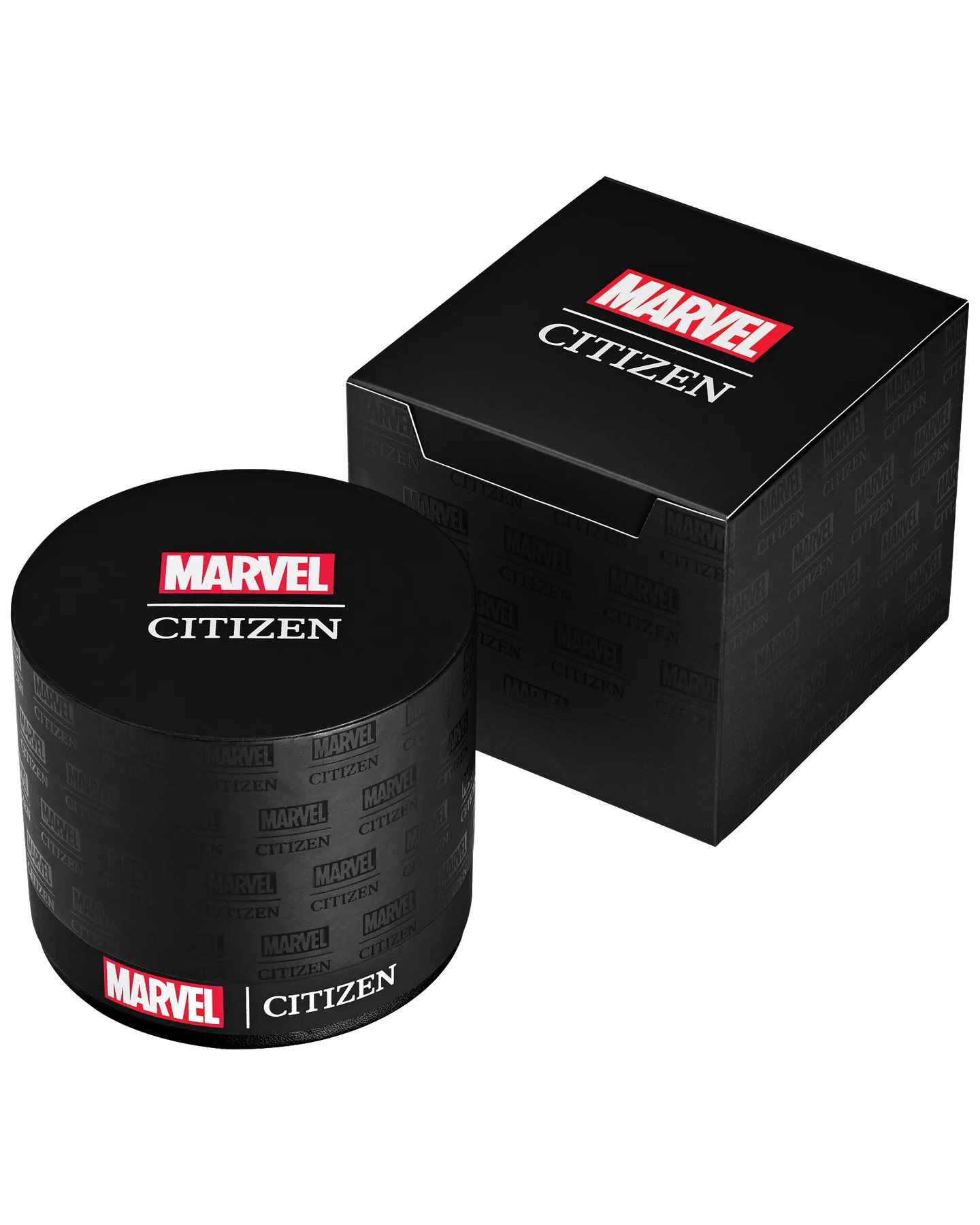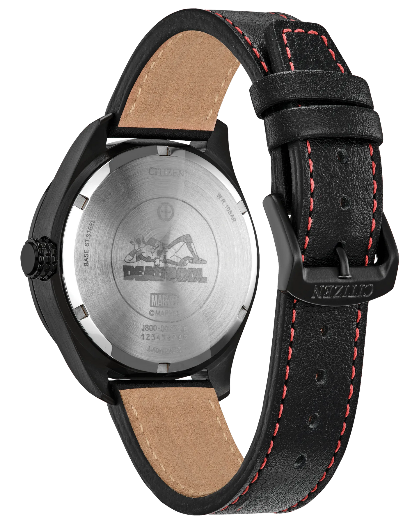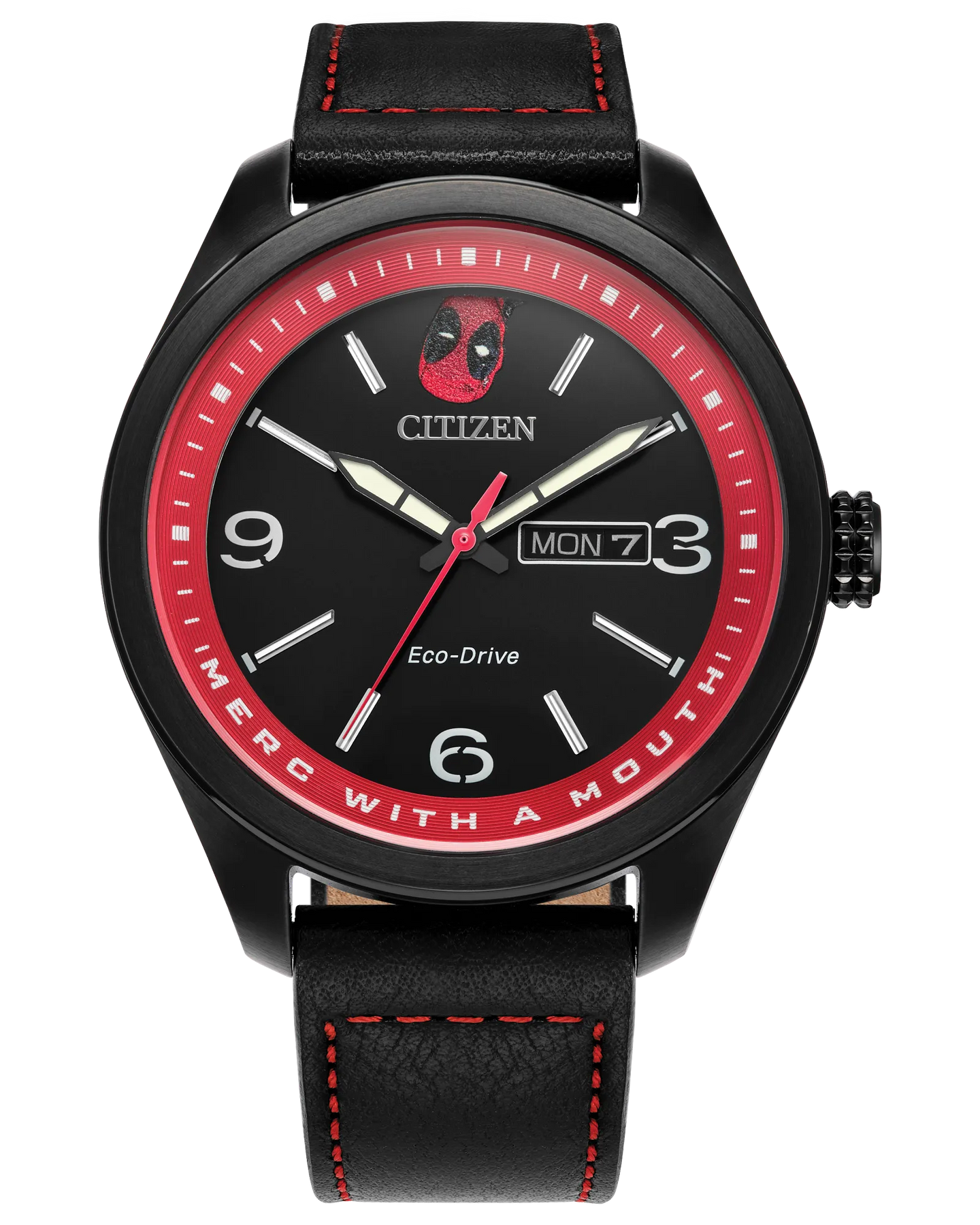 The new Marvel | Citizen Here Comes Deadpool watch breaks the fourth wall with wit and a wink. Its black textured dial features the masked head of Wade Wilson looking directly at you—upside down in the 12 o’clock position. The red dial ring sports the character’s nickname, “Merc With a Mouth,” which is fully illuminated along with his eyes and the hands and markers. The case back is engraved with the Super-slash-Anti Hero in a reclining pose, and the black ion-plated stainless steel 42mm case and black leather strap with red top stitching reflect his signature colors. This watch has a super power, too: it’s sustainably powered by any light with Citizen’s proprietary Eco-Drive technology and never needs a battery. © 2023 MARVEL