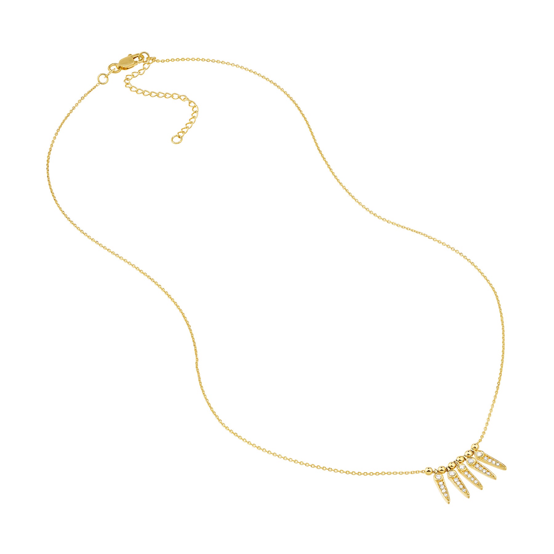 A mini dangle necklace adds a boho vibe to any outfit. This adjustable spike dangle and bead station necklace features 1/6tcw in diamonds.