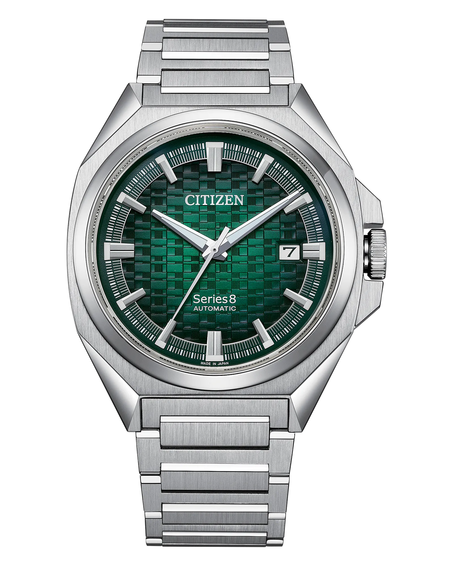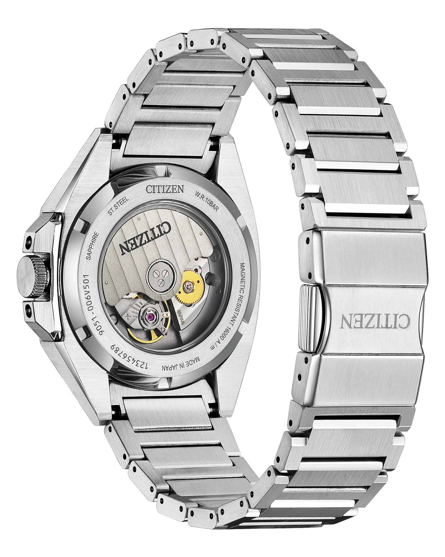 Representing the embodiment of thoughtful design and an ultra-clean execution, the new Series8 831 features a 40mm silver-tone stainless steel faceted case alongside the best of Citizen's brushed and polished finishing techniques. Water resistant to 100m and able to withstand magnetic fields up to 16,000 A/m, the watch is powered by the high-performance Caliber 9051. The automatic movement is visible through a sapphire exhibition case back and is capable of maintaining an accuracy of +20 / -10 seconds per day with a frequency of 28,800 v/h. As a whole, the timepiece's superior technical performance perfectly supports its elevated style.